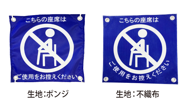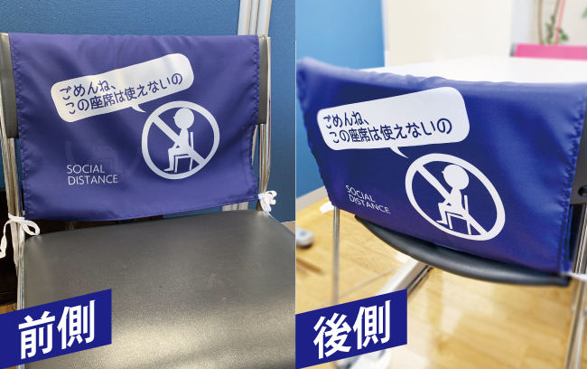 ポリエステル生地で製作する椅子カバーは、洗っていただくことが可能です。また、紙やウッドラック製のPOPと比べて曲げや破れなどに強い特性もあります。感染対策を促すPOPだからこそ清潔感のある状態を保つことでお客様の印象を良くし、ソーシャルディスタンスに協力していただけると思います。